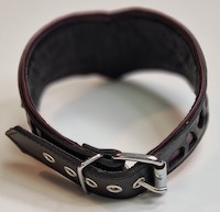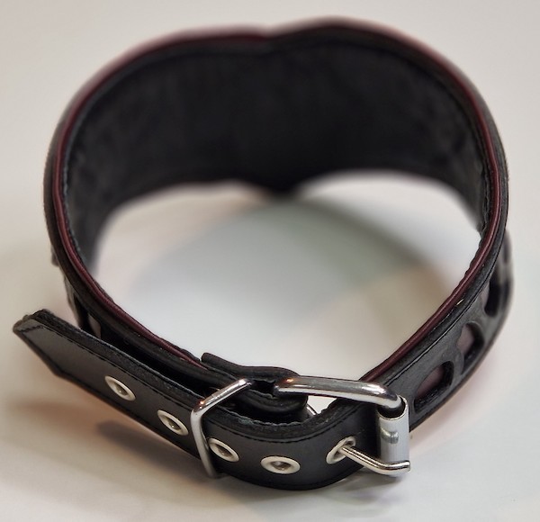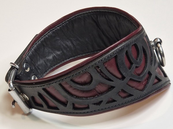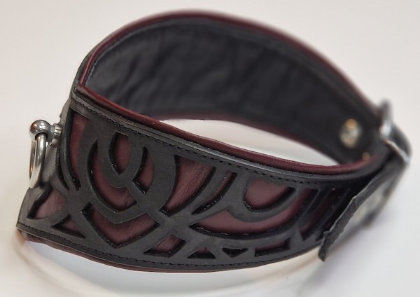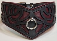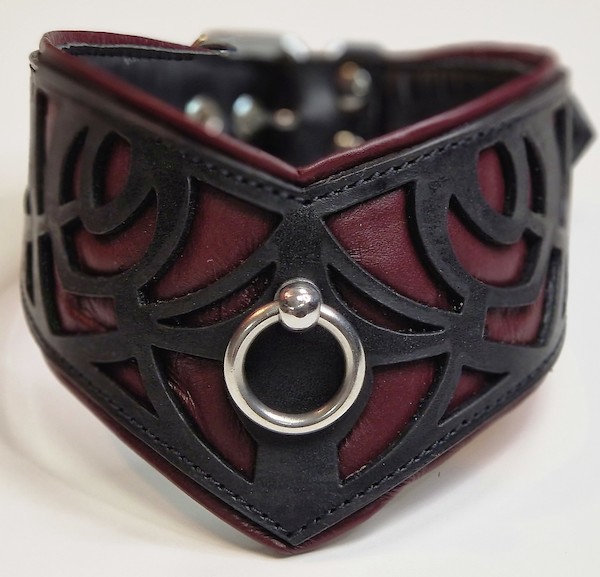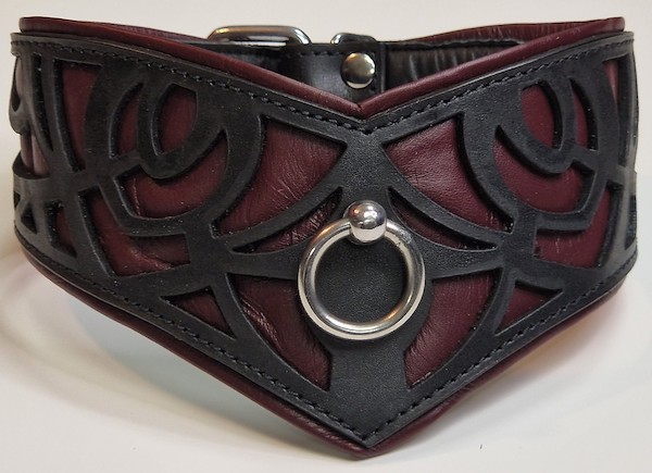 Dieses edle Halsband ist aus weichem burgunderfarbenem Nappaleder gefertigt, welches mit festerem schwarzem ausgeschnittenem Leder belegt ist. Vorn ist ein silber metallener Ring der O eingearbeitet.