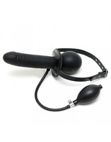 Knebel aus Echt-Leder mit Latex-Dildo und aufpumpbarem Latex-Ball für den Mund. Abmessungen des Dildos: ca. 16 x 4 cm.