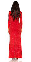 Heißes rotes Glitzerkleid mit langen Ärmeln und ultra langem Beinschlitz aus fließendem Stoff.