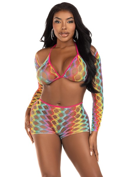 3-tlg. Set: bestehend aus einem Hardcore-Netz-BH-Top, Bolero und Shorts im Regenbogenstil.