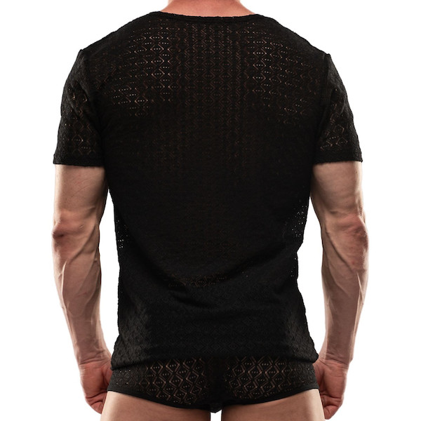 Deutsch Sommer-T-Shirt mit Rundhalsausschnitt und kurzen Ärmeln – Durchbrochener Stretch-Spitzenstoff – TOF Paris-Logo auf dem linken Ärmel aufgenäht.