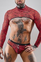 Crop-Top komplett aus hochelastischem und dehnbarem Tüll in den Farben Schwarz und Rot im Zebramuster. Zeigt effektiv nackten Rücken und Oberkörper. Ermöglicht den Zugang zu den Brustwarzen – die zum Spielen verwendet werden können und sollten. Am Umfang im unteren Teil und an den Ärmeln mit Gummiband abgeschlossen. Durch diese Lösung und die elastischen Eigenschaften des Materials passt es sich perfekt an den Körper an und unterstreicht dessen Eigenschaften.