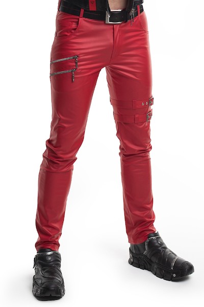 Die Hose aus Wetlook-Material besticht durch ihr kräftiges Rot, fein gearbeitete Details und funktionale Designelemente. Zwei dekorative Reißverschlüsse aus dunklem Metall am rechten Oberschenkel setzen einen markanten Akzent. Zwei verstellbare Riemen mit Schnallen und dekorativen Metallverschlüssen am unteren Teil des linken Oberschenkels sorgen für Stil und Funktionalität. Zwei weitere dekorative Reißverschlüsse an der Rückseite der Unterschenkel runden den Look ab. Die Hose verfügt über Vorder- und Gesäßtaschen, die praktischen Stauraum für Handy, Geldbörse oder andere Kleinigkeiten bieten.