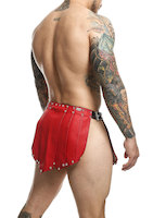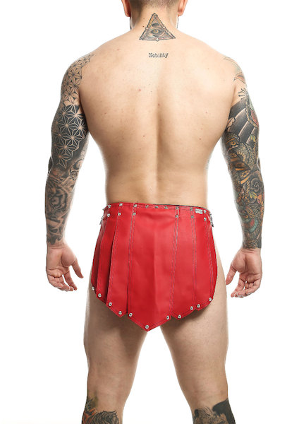 Römerrock aus rotem Kunstleder, schwarz abgesetzt. Individuell verstellbar, an den Seiten offen und mit Nieten besetzt.