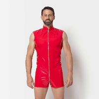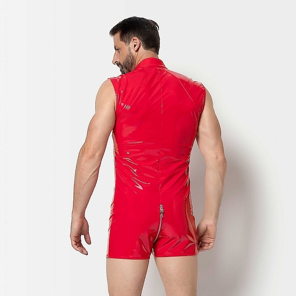 Scharfer Combishort für Ihn aus rotem Lack mit Stehkragen. Der 3-Wege-Reißverschluss führt durch den Schritt.