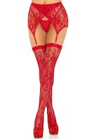 2-tlg. Set: mit Spitze besetzte Strümpfe & gekreutzter Strumpfgürtel in rot.