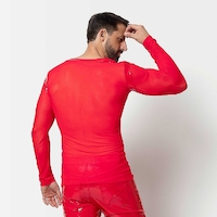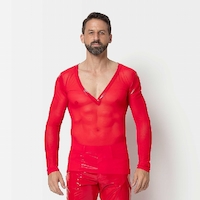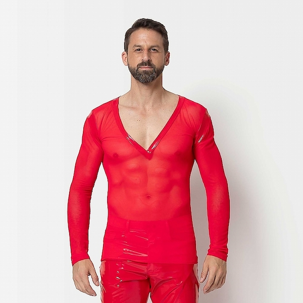 Langarmshirt aus rotem Feinnetz mit V-Ausschnitt. Mit Rotlack eingefasst.