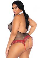 Schulmaedchen-Body aus Netz, mit Krawattendetail. Crotchless und offene Po-Ansicht.