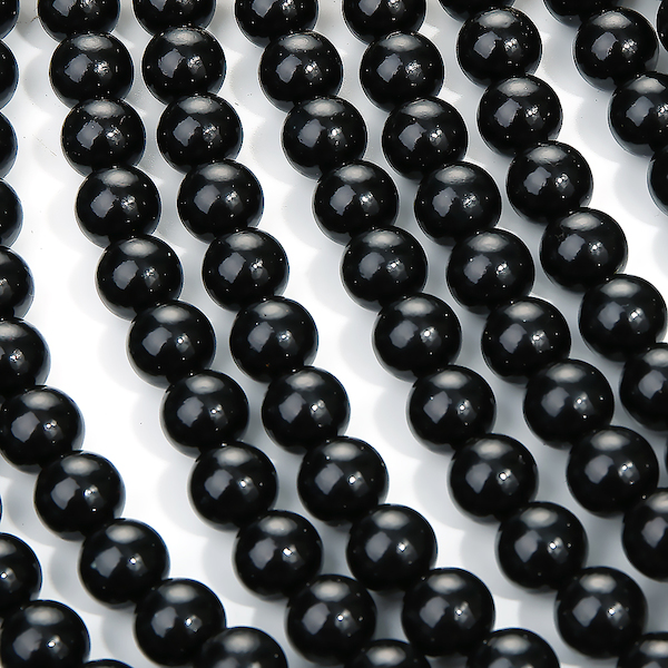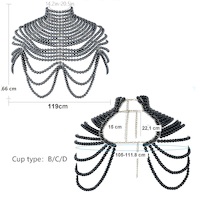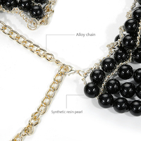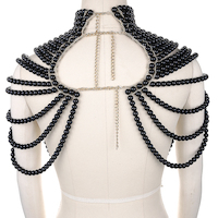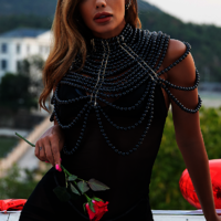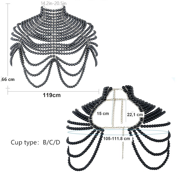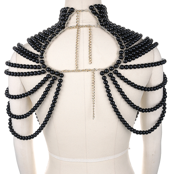 Oberkörperschmuck aus schwarzen Perlensträngen vom Hals bis unter die Brust. Mit goldenen Ketten im Rücken variabel zu schließen. Als eigenständiges Kleidungsstück oder als aufregendes Accessoire über der Kleidung zu tragen.