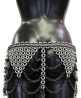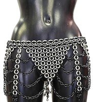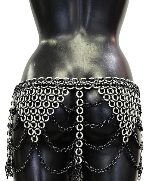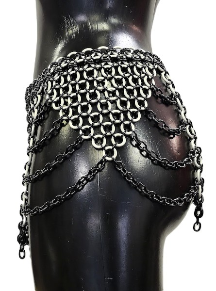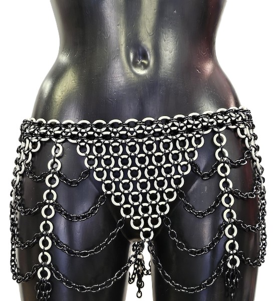 Ketten-Hüftrock aus schwarzen Metallringen und flexiblen weißen Latexringen. Wunderschön in Dreicks- und Strapsoptik gestaltet.