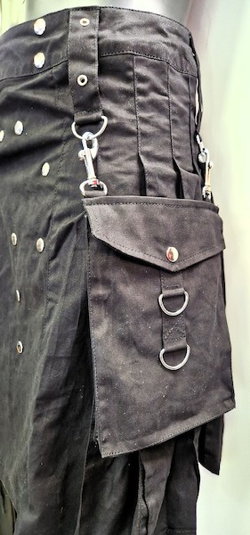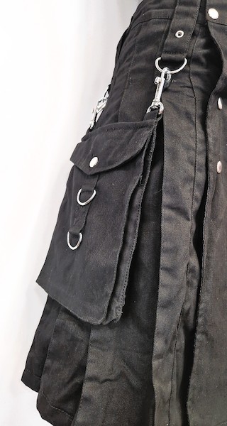 Männerrock aus schwarzem Denim-Stoff (Baumwolle) mit silbernen Nieten und zwei seitlichen Taschen (mit Karabinern abnehmbar) und Gürtelschlaufen im Kiltschnitt.