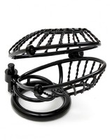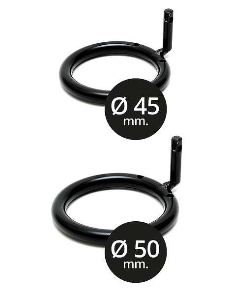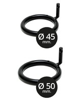 Aufklappbarer Peniskäfig aus schwarzem Metall und zwei Vorhängeschlössern. Es sind zwei Penisringe in 45 und 50 mm beigelegt.