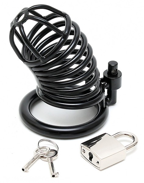 Peniskäfig aus schwarzem Metall mit Vorhängeschloss und zwei verschiedenen Penisringgrößen: 45 und 50mm.