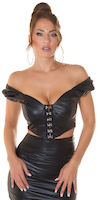 Schwarzes Lederlook Crop Top schulterfrei mit Hakenverschluss vorn.