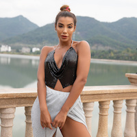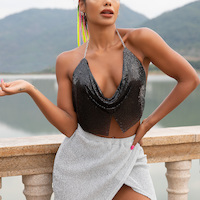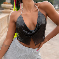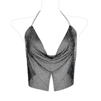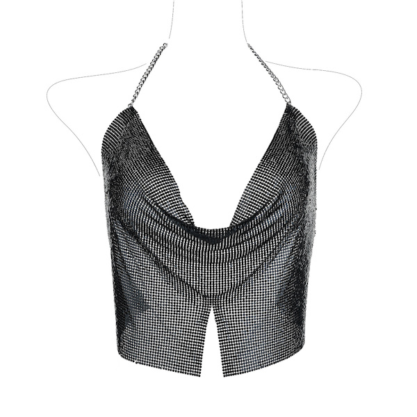 Schwarzes Oberteil aus Matall-Pailetten mit Ketten-Neckholder und -rücken. Wasserfallausschnitt. Verstellbar.