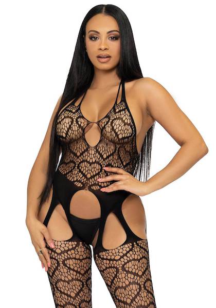 Nahtloser schwarzer Netz-Straps-Bodystocking mit Herzmuster.