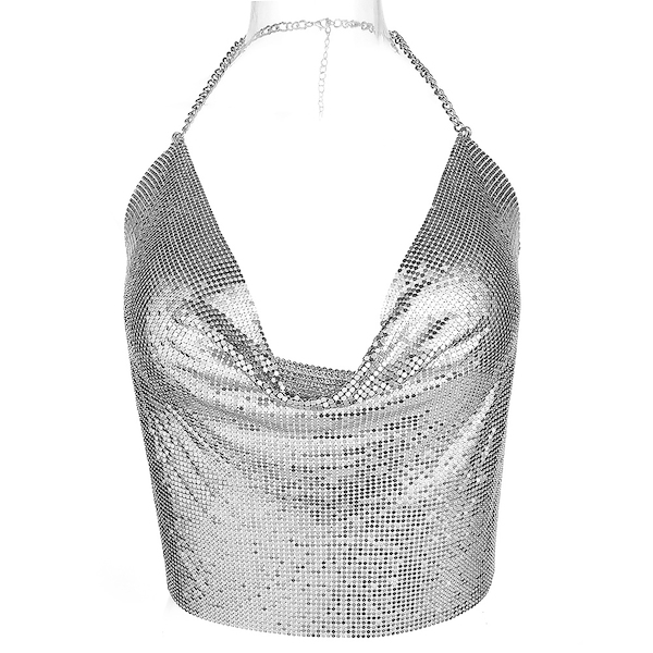 Silbernes Oberteil aus Matall-Pailetten mit Ketten-Neckholder und -rücken. Wasserfallausschnitt. Verstellbar.