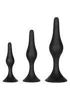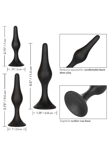 Lassen Sie sich mit dem Silikon-Anal-Starter-Kit in ein aufregendes Analgefühl ein. Dieses freche Kit enthält ein Set aus 3 abgestuften, konisch zulaufenden Analplugs, mit denen Sie die leidenschaftliche anale Stimulation sicher und bequem steigern können. Um alles genießen zu können, was die aufregende Welt des Analspiels zu bieten hat, ist Training erforderlich, um absolute Sicherheit und Zufriedenheit zu gewährleisten. Jede Sonde in unserem Kit nimmt allmählich an Länge und Umfang zu, um ein hervorragendes Vergnügen auf jeder Ebene des Lustspiels zu erzielen. Während jede Steigerung Ihres Trainings Ihren Horizont erweitert, verwenden Sie die praktische geflanschte Basis für dampfende Stimulation, müheloses Einführen und sanftes Entfernen. Die flexiblen Sonden bestehen aus einem glatten, nahtlosen Satin-Finish-Silikon. Dieses körpersichere Material ist geruchs- und phthalatfrei, um Ihre empfindlichsten Stellen glücklich und gesund zu halten.