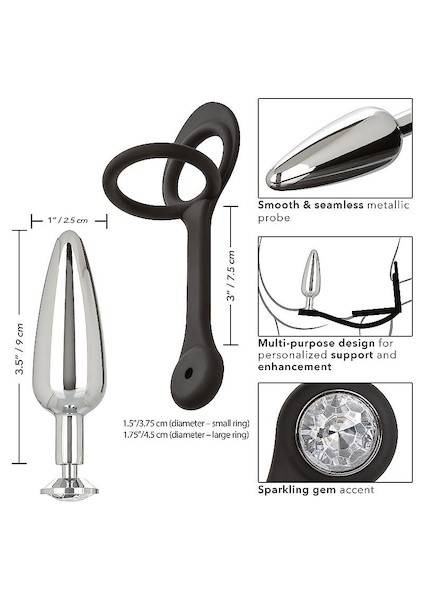 17.75cm x 5.75cm (Enhancer) | 9cm x 2.5cm (Plug) | 7.5cm x 1.25cm (Strap) | 4.5cm (Large Ring Diameter) | 3.75cm (Small Ring Diameter)