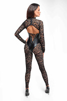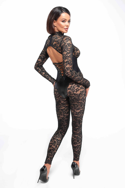 Catsuit aus weicher Spitze mit elastischem Miederteil aus Mattlook mit Reißverschluss durch den Schritt und elegantem Rückenausschnitt und Schnürung.