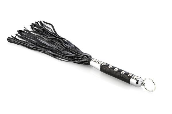 Schwarze PU Kunstlederpeitsche, die für zarte Streicheleinheiten sowie harte Bestrafungen und Sklavenzüchtigungen eingesetzt werden kann.