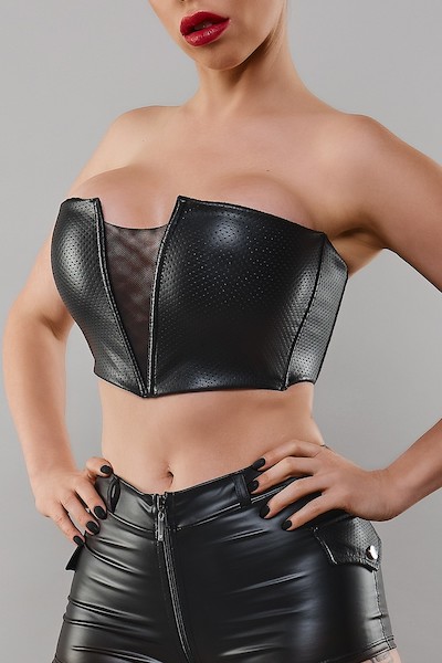 Ein sehr originelles und einzigartiges Oberteil im Design. Vorne zeichnet es sich durch eine dreieckige Form aus schwarzem Mesh aus, durch die das Dekolleté reizvoll zum Vorschein kommt. Die spezielle Konstruktion und die im Oberteil versteckten verstärkenden Bügel garantieren das auf den Bildern dargestellte Aussehen. Das Oberteil besteht komplett aus schwarzem, perforiertem Wetook, das sich perfekt an den Körper anschmiegt.
