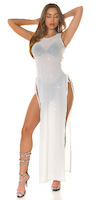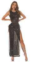 Langes schwarz-transparentes oder weiß-transparentes glitzerndes Kleid zum Binden mit langem Beinausschnitt.