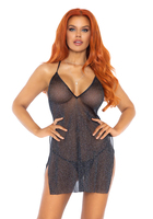 Verführerisches Träger-Kleidchen aus leicht durchscheinendem Stretch-Stoff mit Beinschlitzen und silbernen Fasern.