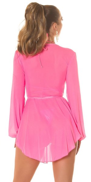 Pinkes durchscheinendes Minikleid mit langen Ärmeln und ausgestelltem Rock.