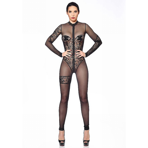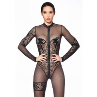 Durchsichtiges Catsuit aus elastischem weichen Stoff mit interesanter Corsagenoptik durch Dschungel-Muster-Stoff. Vorderer durchgängiger Reißverschluss.