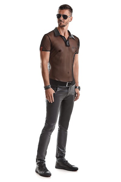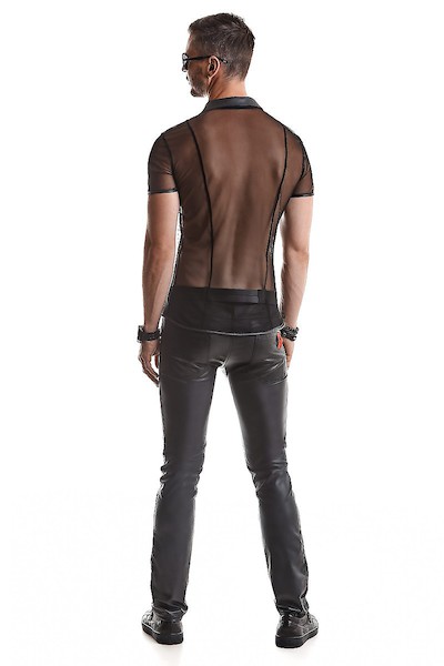 Sein Hauptmerkmal ist Transparenz - dank ihm können Sie die Umrisse des Körpers und der Muskeln sehen. Der Kragen ist aus schwarzem Wetlook, hinten weiten zwei senkrechte Steppnähte den Rücken optisch und betonen die schmale Taille.