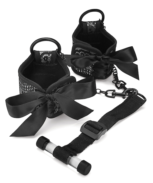Over The Door Cuffs geeignet für jede Standardtür, stabiler Aufhänger perfekt für stehende Fesselspielchen, Klettverschlüsse für sichere Fesselung und einfache Entfernung, elegante schwarze Spitze auf glänzendem grauem Stoff mit sinnlichen weichen Satinbänder. Manschetten & Bänder (100% Polyester), Riemen (100% Polypropylen), Ketten, Ringe, D-Ring & Karabiner (100% nickelfreies Eisen), Verstellschnalle (100% Kunststoff), Aufhänger (100% Acryl)