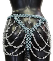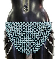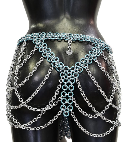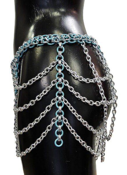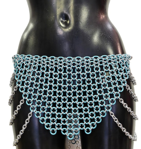 Schöner Kettenrock, gefertigt aus silbernen Metallringen und türkisen Latexringen flexibler Natur. Hüftumfang: ca. 94-98 Echte Handarbeit.