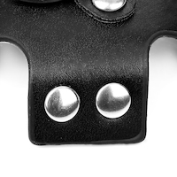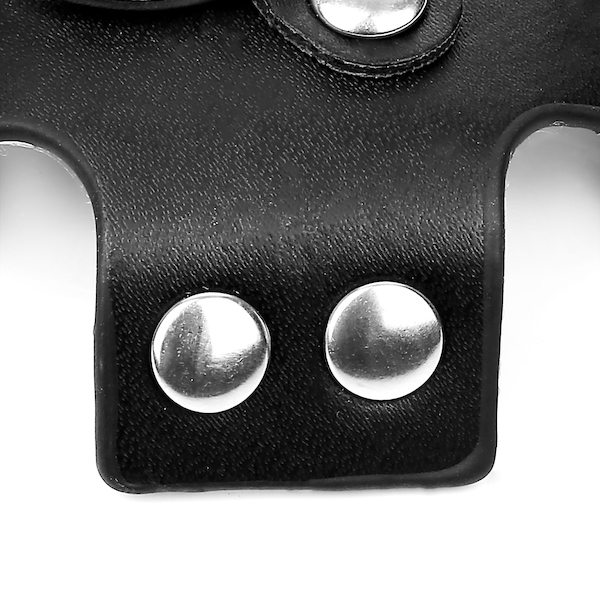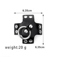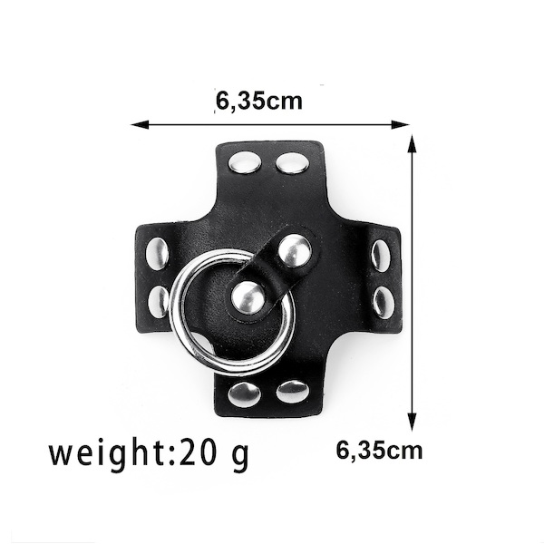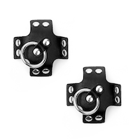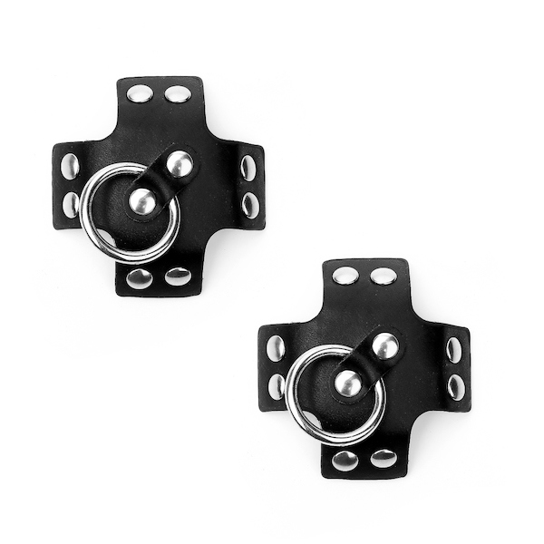Kreuzförmige Nipplepasties aus Kunstleder mit Ring der O und Nieten. Selbstklebend.