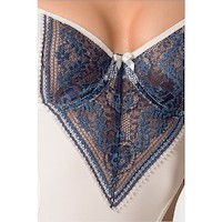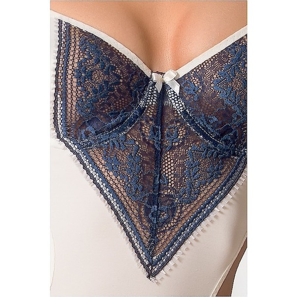 Herrlicher weißer Spi.elbody mit blauer Spitze am Bügel-BH und an der Hüfte. Im Schritt mit zweifacher Hakenleiste in der Länge verstellbar.