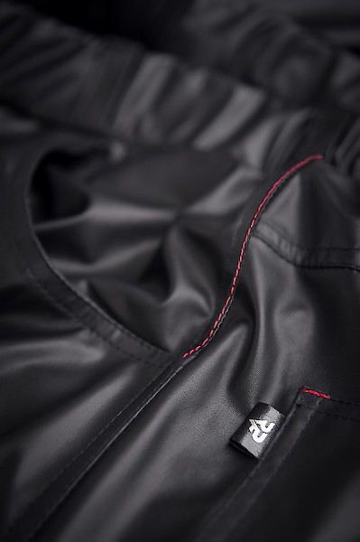 Elastisches und belastbares Material, Verstärkungsnähte, roter Alcantara-Patch, rote Ziernähte.