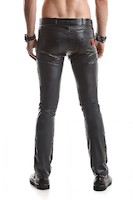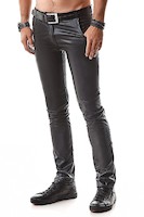 Hose mit niedriger Taille. Komplett aus dehnbarem, schwarzem Wetlook-Stoff.